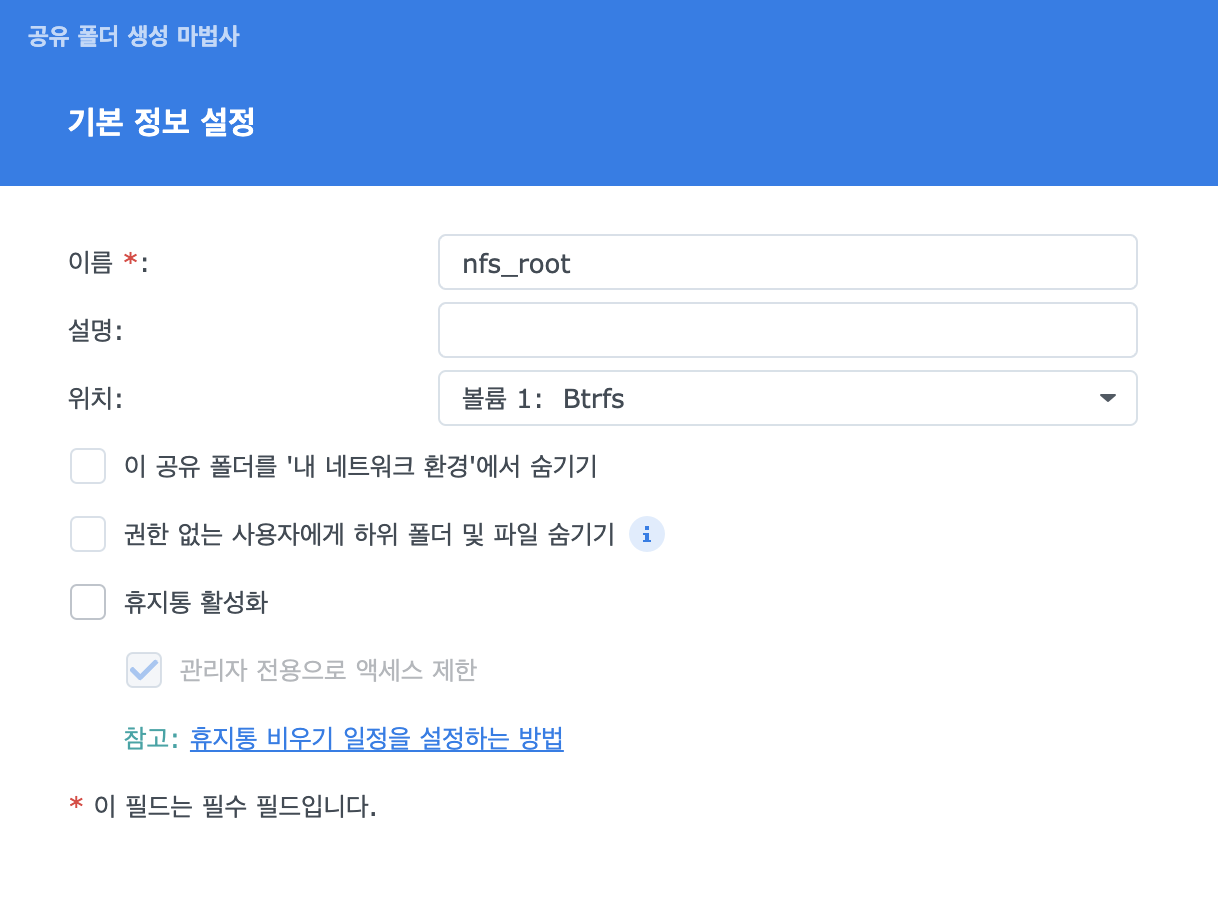 NAS에서 공유 폴더를 다음과 같이 생성하였다. (무결성 체크 옵션, 휴지통등 nfs에 어울리지 않는건 모두 비활성화)
